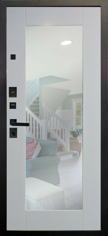 Повышенной надежности российская сейф-дверь с большим зеркалом на внутренней панели со стильной внешней отделкой муар черный. Прекрасно подойдет для установки в квартиру. Солидная модель, которая хорошо защитит и подчеркнет статус.