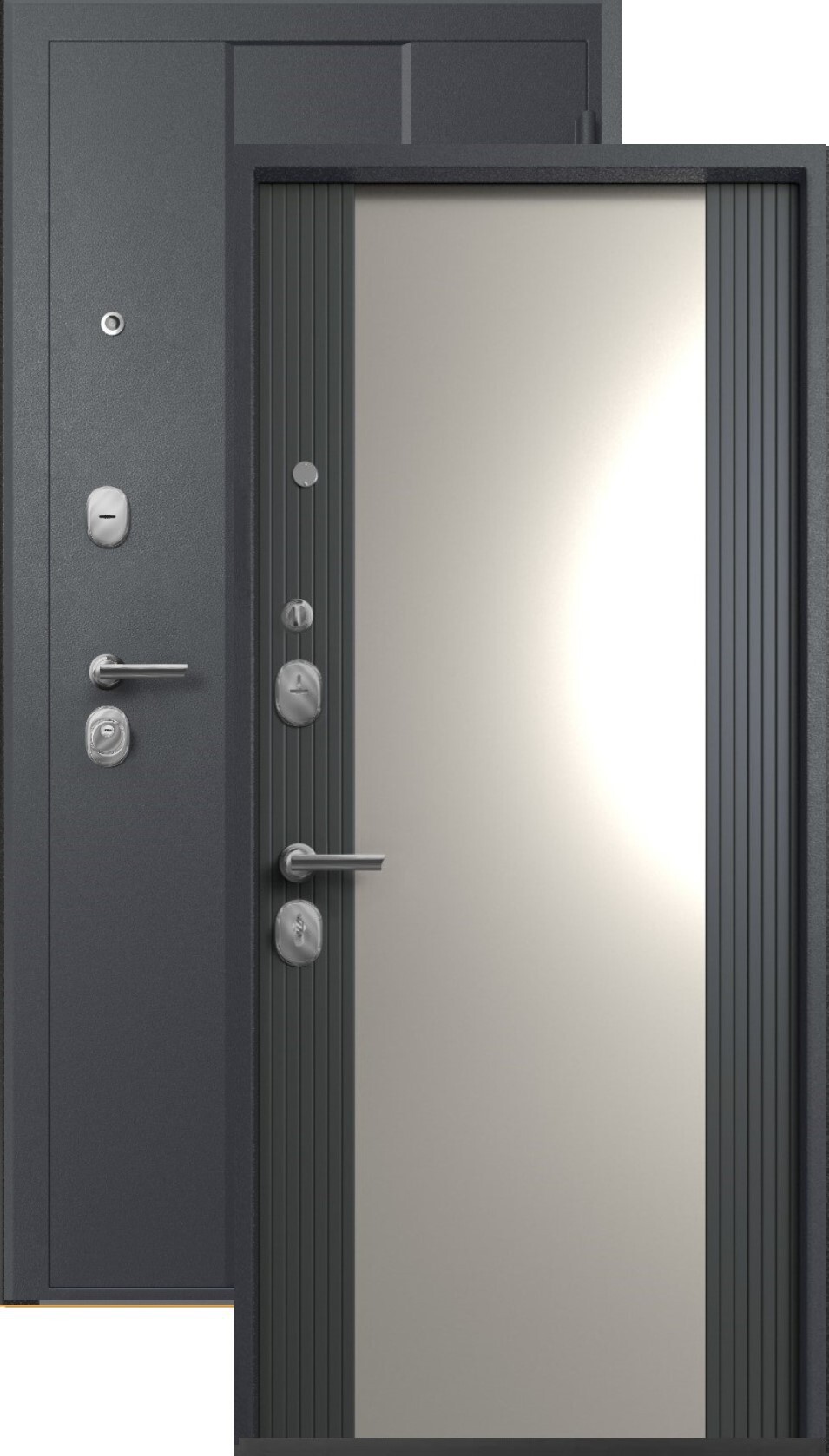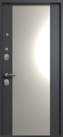 Повышенной надежности российская дверь с большим зеркалом на внутренней панели со стильной внешней отделкой графит муар (RAL7024). Прекрасно подойдет для установки в квартиру. Солидная модель, которая хорошо защитит и подчеркнет статус.