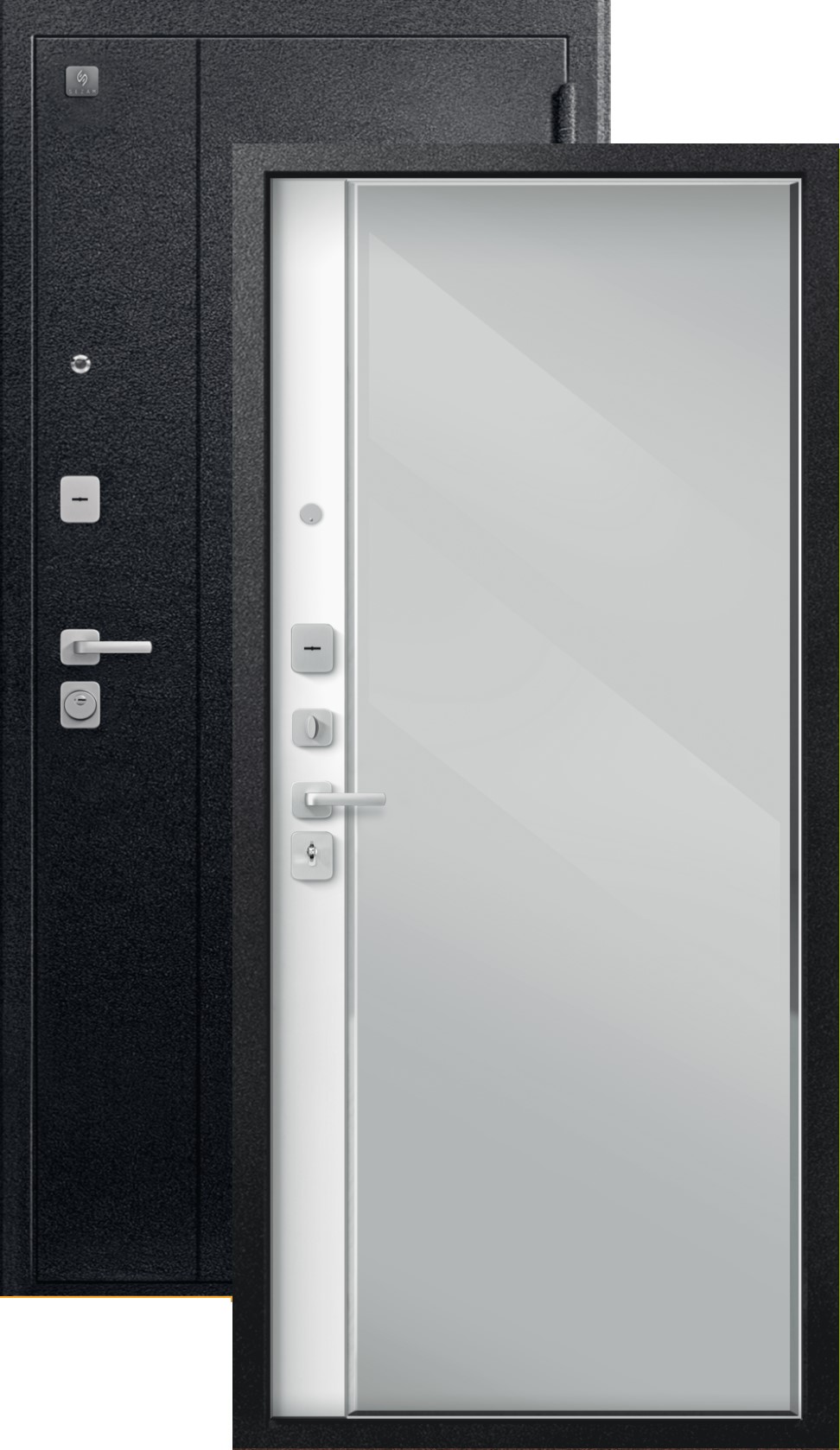 Качественная российская дверь с большим зеркалом на внутренней панели со стильной внешней отделкой муар черный. Прекрасно подойдет для установки в квартиру. Надежная модель, которая прослужит долгие годы.