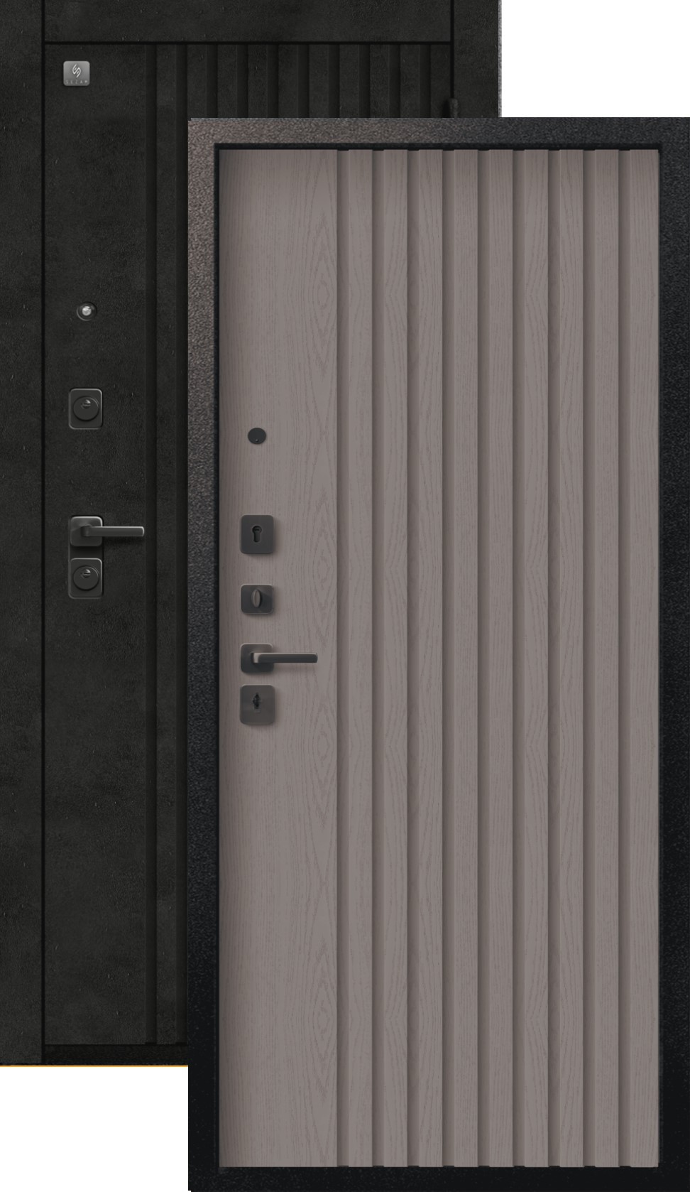 Повышенной надежности российская дверь со стильной внешней отделкой муар черный/бетон темный и красивой декоративной панелью толщиной 8 в цвете софт ясень грей. Прекрасно подойдет для установки в квартиру. Солидная модель, которая хорошо защитит и подчеркнет статус.