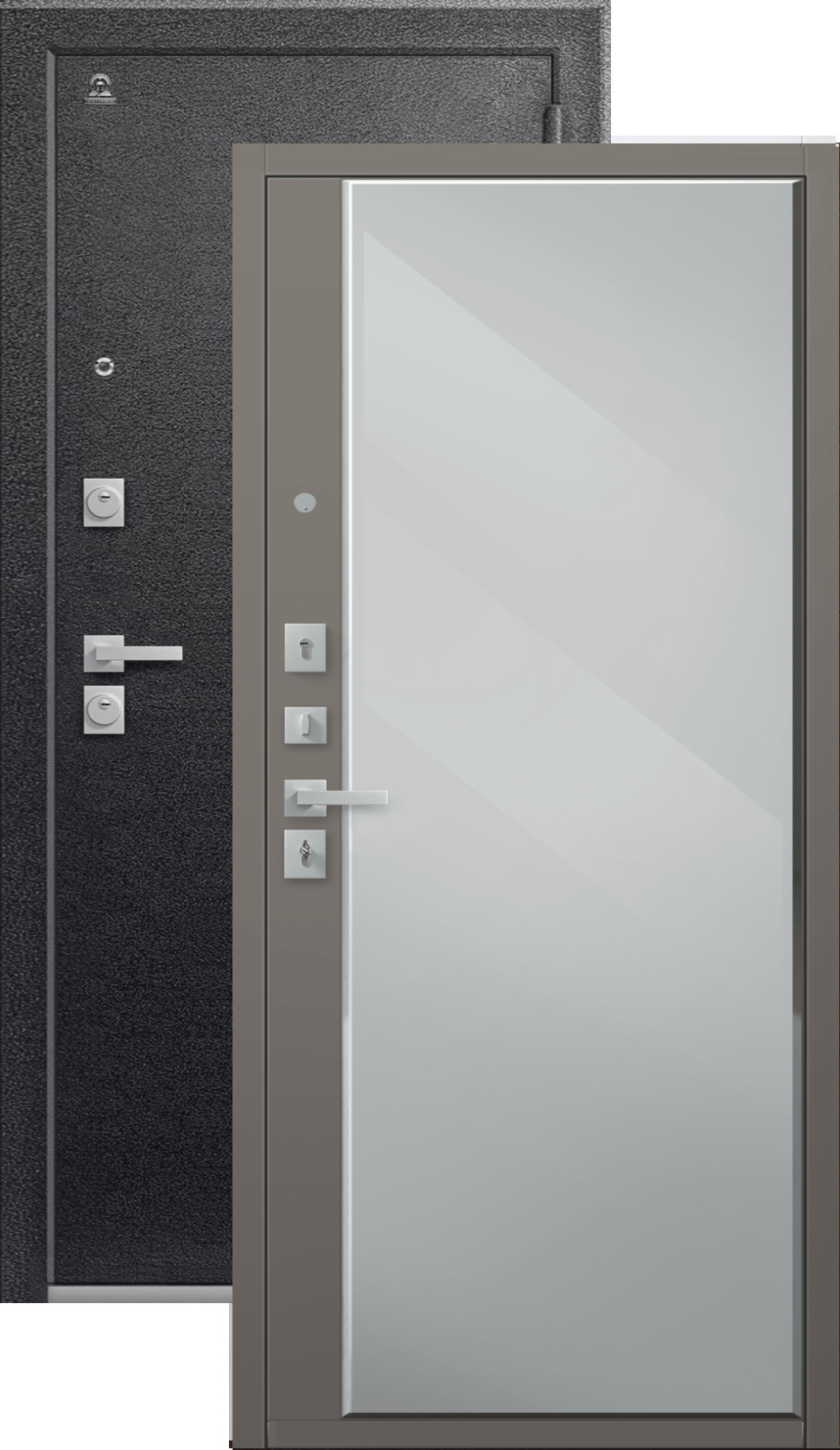 Повышенной надежности российская сейф-дверь с большим зеркалом на внутренней панели со стильной внешней отделкой муар черный. Прекрасно подойдет для установки в квартиру. Солидная модель, которая хорошо защитит и подчеркнет статус.