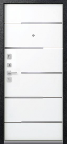 Повышенной надежности российская дверь со стильной внешней отделкой муар черный и красивой декоративной панелью толщиной 16 в цвете кашемир белый. Прекрасно подойдет для установки в квартиру. Солидная модель, которая хорошо защитит и подчеркнет статус.