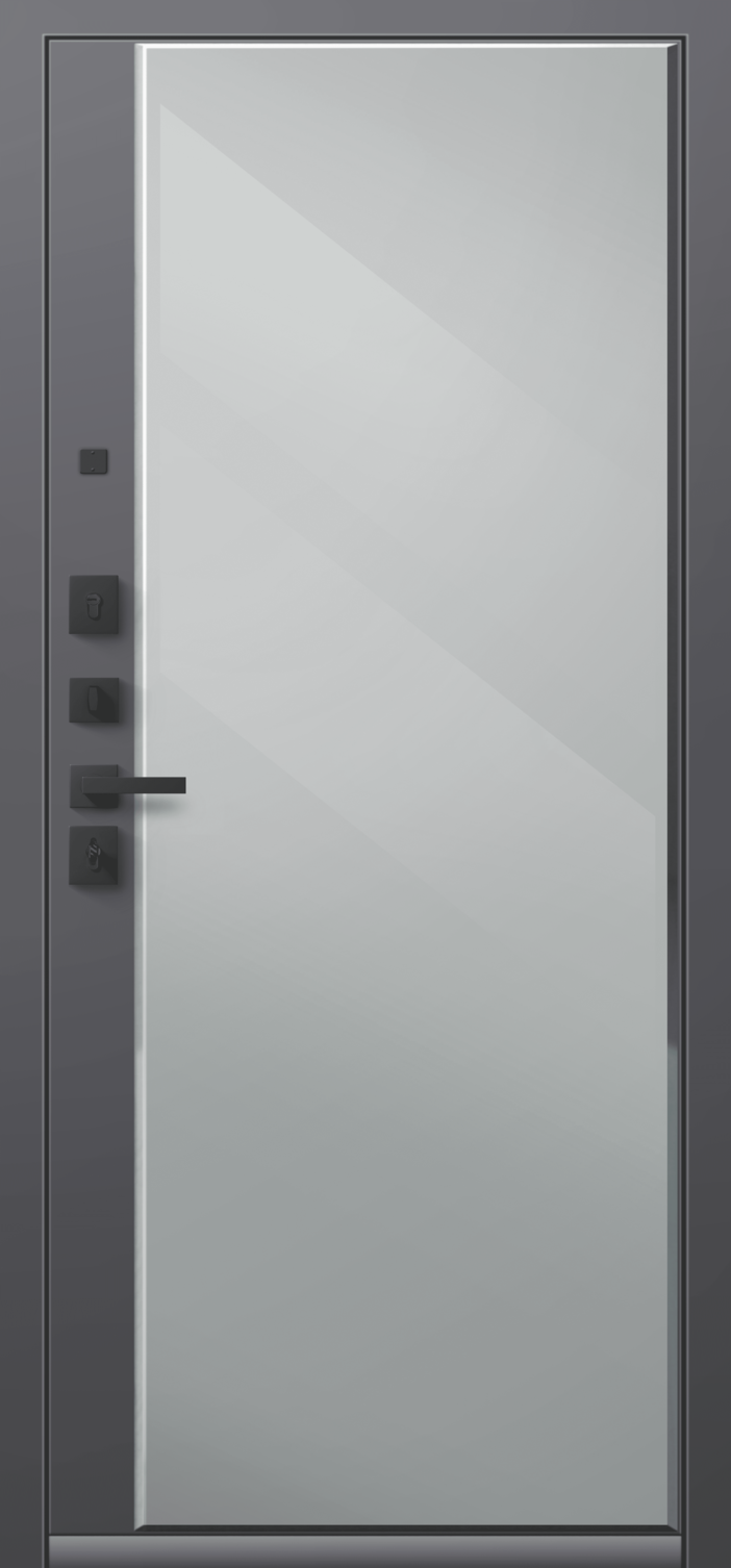 Повышенной надежности российская сейф-дверь с большим зеркалом на внутренней панели со стильной внешней отделкой муар черный/бетон темный. Прекрасно подойдет для установки в квартиру. Солидная модель, которая хорошо защитит и подчеркнет статус.