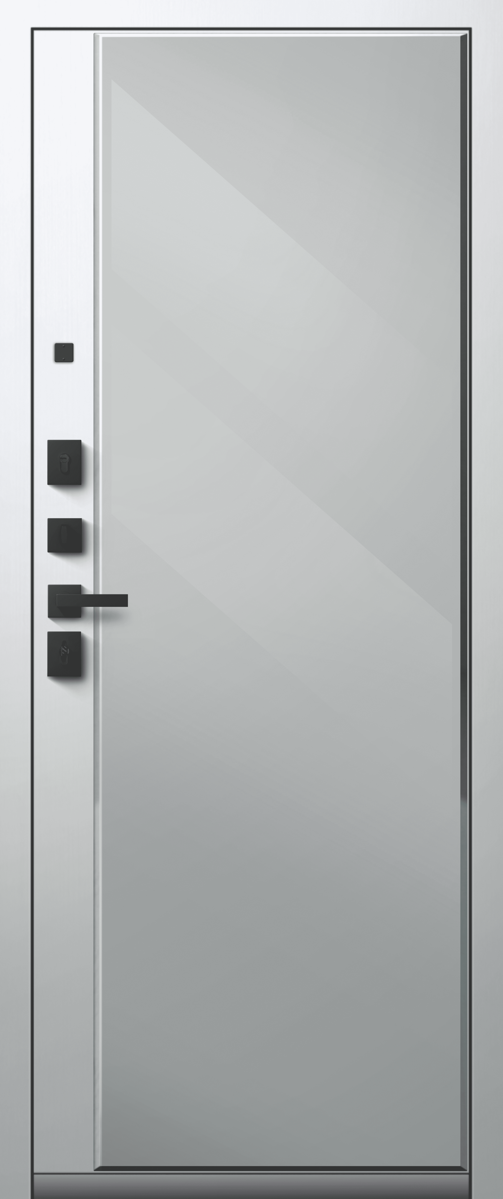Повышенной надежности российская сейф-дверь с большим зеркалом на внутренней панели со стильной внешней отделкой муар черный/бетон темный. Прекрасно подойдет для установки в квартиру. Солидная модель, которая хорошо защитит и подчеркнет статус.